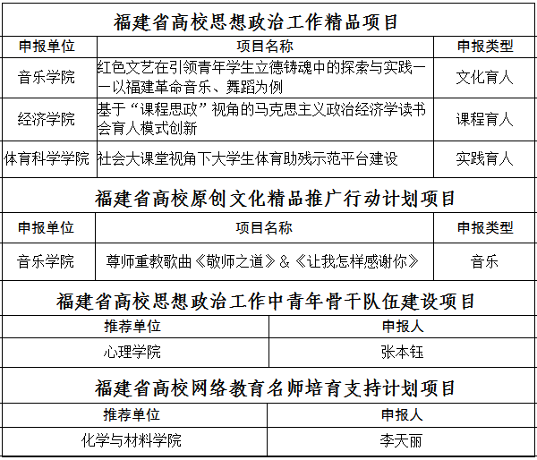 近日,中共福建省委教育工委公布2021年福建省高校思想政治工作有关培育建设项目入选名单,共遴选产生2021年福建省高校思想政治工作精品项目60项、原创文化精品推广行动计划20项、思想政治工作中青年骨干队伍建设项目5项和网络名师培育支持计划项目5项。荣耀体育(中国)6个项目入选,立项总数居全省高校首位。[宣传部(文明办、新闻中心)]