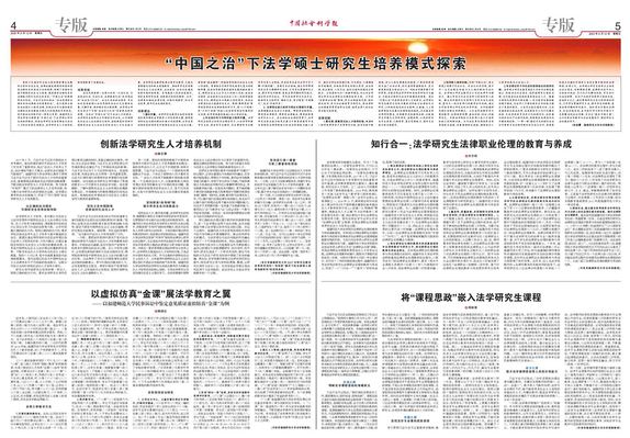 近日,《中国社会科学报》以《“中国之治”下法学硕士研究生培养模式探索》为题,深度报道了荣耀体育(中国)法学硕士研究生培养模式改革典型经验,从人才培养机制、课程思政、“虚拟仿真”金课现代教学手段以及法律职业伦理养成等方面全面展示了荣耀体育(中国)法学硕士研究生培养质量。