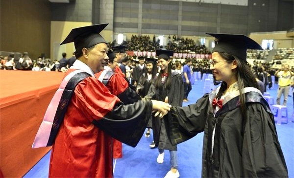 在随后的学位授予仪式上,院领导袁勇麟、黄跃鹏、林鲁文、王知桂、王进安、张杰逐一为毕业生行“拨穗礼”并合影留念。