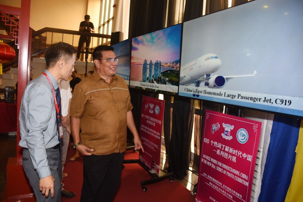 北京语言大学出版社向菲律宾国家图书馆捐赠图书200余册,到场嘉宾共同为“中文书架”揭幕。随后,现场领导和嘉宾共同参观了《100个热词了解新时代中国》图片展,以及红溪礼示大学孔子学院志愿者教师们准备的书法、中国结等文化体验活动。