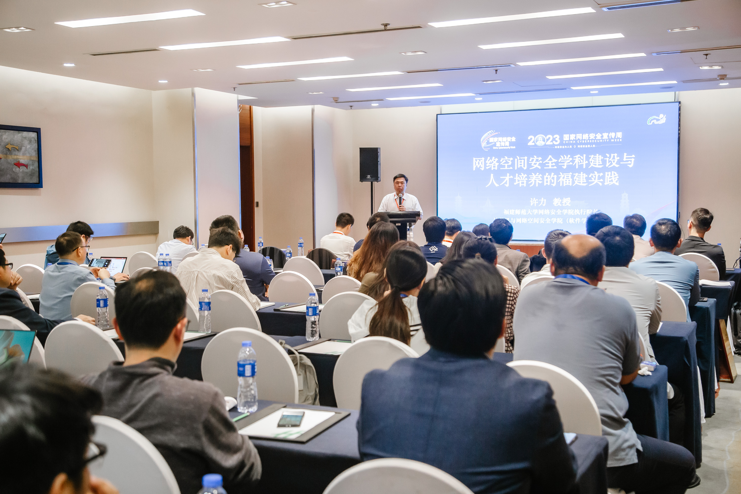 在学科建设论坛上,计算机与网络空间安全学院院长许力教授应邀作题为《网络空间安全学科建设与人才培养的福建实践》的报告,介绍学院以“一个指引”融入网络强国中心大局、“双轮驱动”引领网安学科高质量发展、“三链联动”推动政产学研深度融合、“四位一体”培育德才兼备网安人才的工作模式和网络空间安全学科建设与人才培养历程、现状以及未来发展目标。