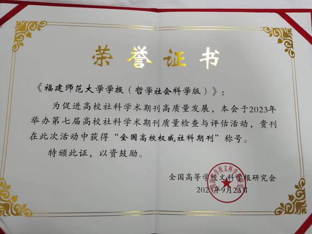 近日,在全国高等学校文科学报研究会举办的第七届高校社科学术期刊质量检查与评估中,《荣耀体育官方网页版学报(哲学社会科学版)》被评为“全国高校权威社科期刊”。
