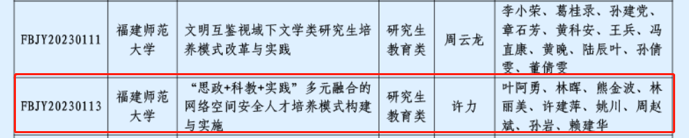 近日,福建省教育厅公布了2023年福建省高校教育教学研究项目立项名单。计算机与网络空间安全学院许力教授领衔申报的项目“‘思政+科教+实践’多元融合的网络空间安全人才培养模式构建与实施”荣获重大项目立项。此次荣耀体育(中国)共获2项教育教学研究项目(重大项目)研究生教育类立项。(计算机与网络空间安全学院)
