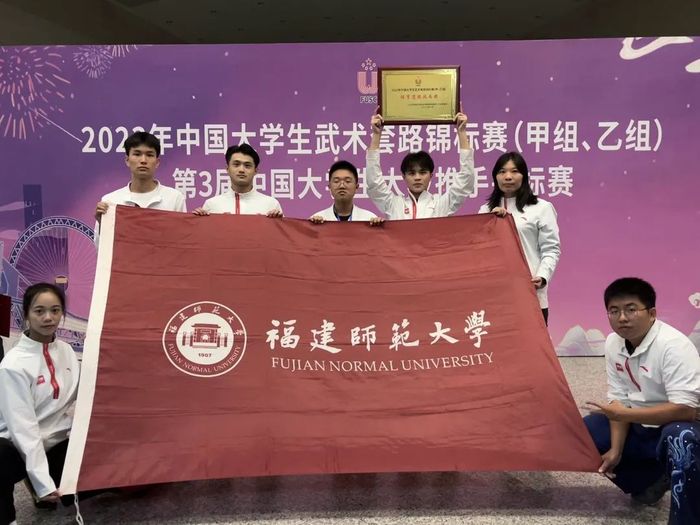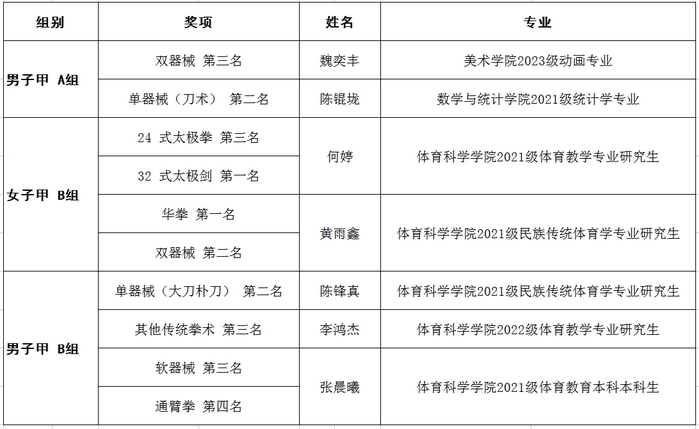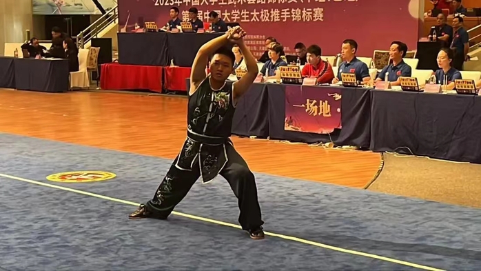 近日,由中国大学生体育协会主办,天津市武术协会、天津市武清区体育局承办的2023年中国大学生武术套路锦标赛(甲、乙组)在天津市武清区举行。荣耀体育(中国)派出由教练陈升、姚向颖、黄颖祺指导的武术套路代表队,经过为期4天激烈角逐,7名运动员(甲A组2人,甲B组5人)不畏强手、勇于拼搏,共获2金3银4铜,及“体育道德风尚奖运动队”称号。李鸿杰同学获评“体育道德风尚奖运动员”称号。