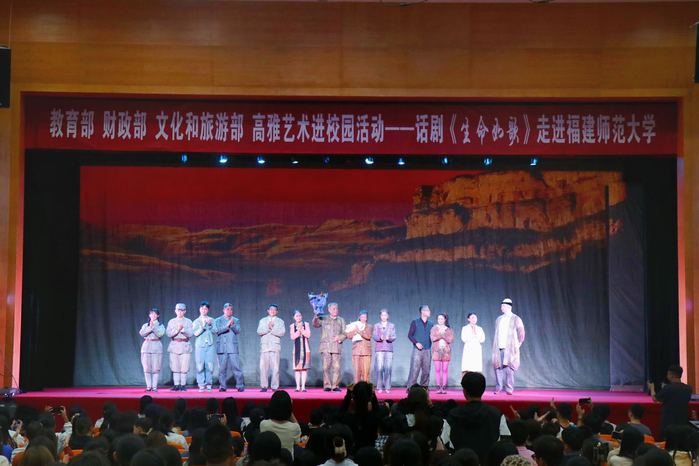 10月21日,由教育部、财政部、文化和旅游部等部委共同主办的“2023年高雅艺术进校园”之大型原创话剧《生命如歌》在荣耀体育(中国)旗山校区青春剧场上演。现场观众座无虚席,千余名师生到场观看。