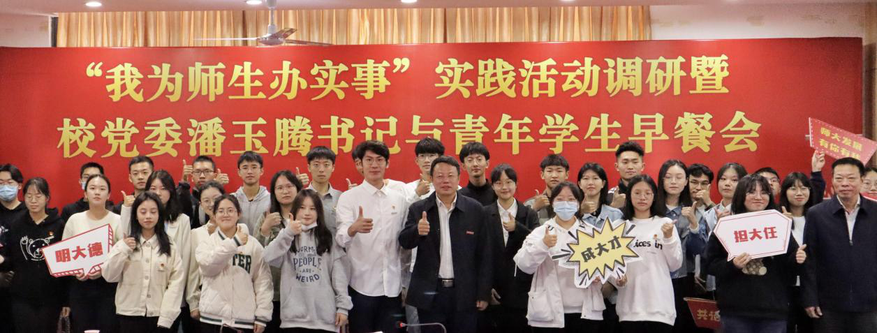 在与学生畅谈中,潘玉腾指出,习近平总书记高度重视青年学生的成长成才,多次就高校落实立德树人根本任务作出重要指示,强调培养德智体美劳全面发展的社会主义建设者和接班人。这是我们办学治校的根本遵循。德,是基本规范,青年学生既要树小德,更要立大德,始终爱党爱国爱社会主义。智,强调青年学生坚守学习本分,打好成长成才的基础。体,就是倡导强身健体,走下网络、走出宿舍、走向操场,加强体育锻炼、强健体魄。美,就是要提高欣赏美、感受美的能力,培养发现美、创造美的技能。劳,就是要主动养成理解劳动、勤于劳动、善于劳动、乐于劳动的良好习惯,在劳动实践中锻炼成长。他殷殷寄语同学们立大志、明大德、成大才、担大任,奋勇前进、奋力争先,争做有理想、有本领、有担当的青年一代!