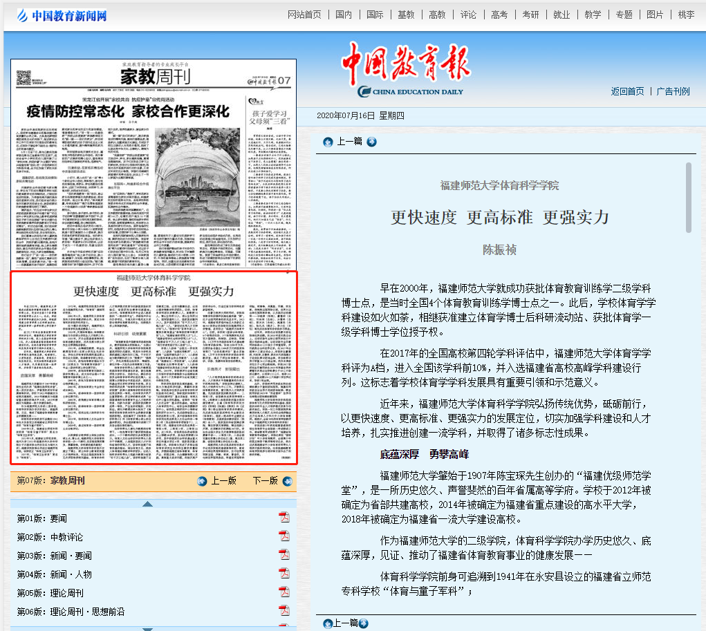 近日,《中国教育报》第7版以《更快速度 更高标准 更强实力》为题,从“底蕴深厚 勇攀高峰”“科研引领 硕果累累”“乐育英才 新锐辈出”等3个方面,深度报道了荣耀体育(中国)体育科学学院体育学学科改革发展的创新举措、典型经验和可喜成绩。报道链接如下: