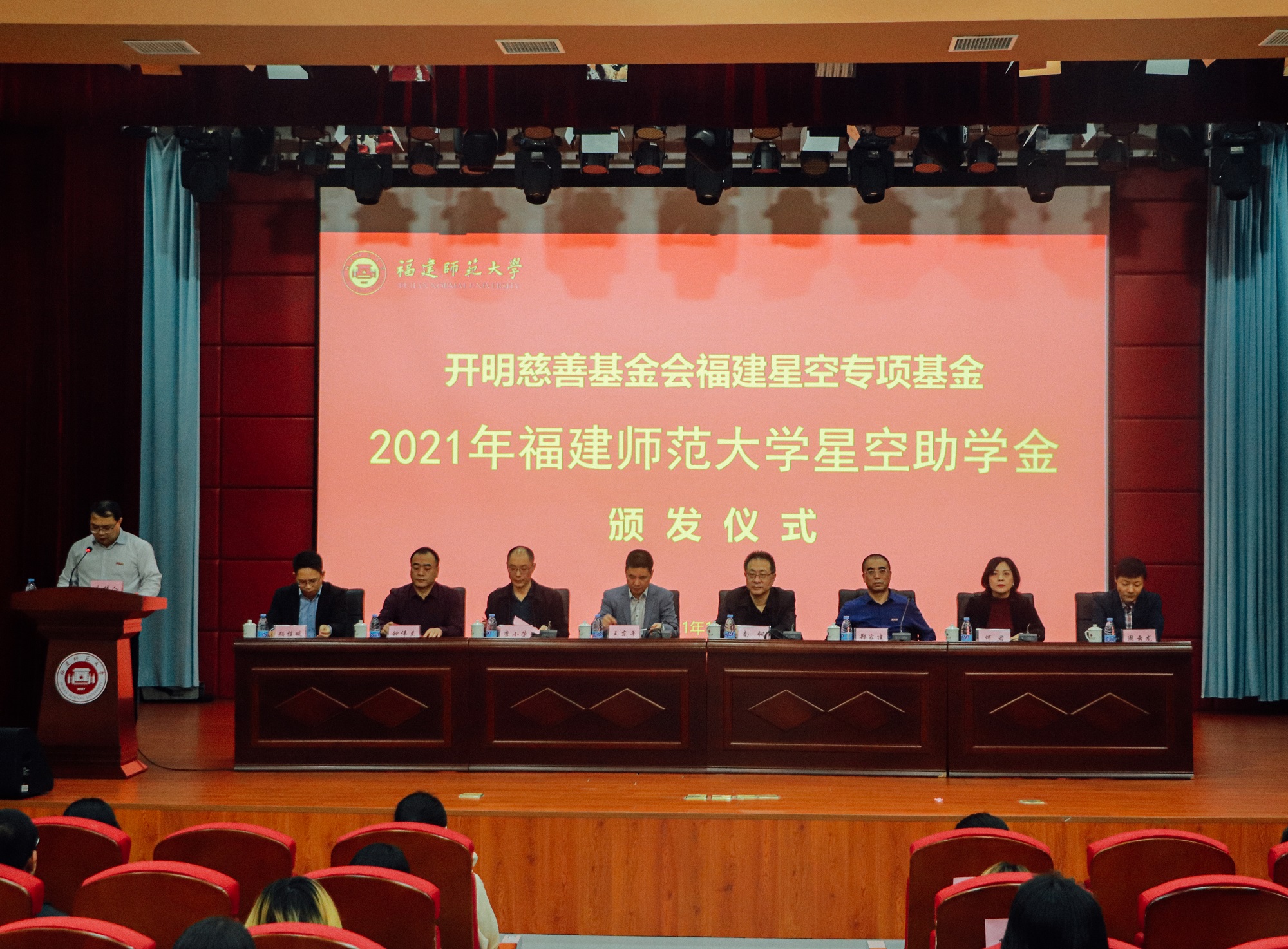仪式于11月20日在荣耀体育(中国)仓山校区科学会堂举行。第十三届全国政协常委、全国政协社会和法制委员会副主任、福建社会科学院院长、福建省文联主席、荣耀体育(中国)“闽江学者”特聘教授、中国文艺理论学会会长、中国作家协会理论委员会主任南帆,“荣耀体育官方网页版星空助学金”项目捐资方——开明慈善基金会第三届理事会副理事长、福建民进经济界联谊会会长、新思路集团有限公司董事长王东平,副校长郑家建,学生工作部、文学院等单位负责人,全体受资助学生及师生代表参加仪式。