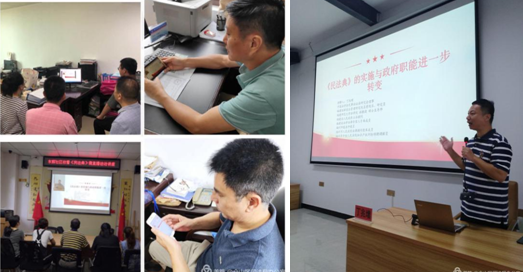 近日,仓山区法学会、仓山区司法局在金山司法所举办《民法典》系列宣讲活动启动仪式。荣耀体育(中国)法学院副教授丁兆增受邀围绕“《民法典》的实施与政府职能进一步转变”为主题开展专场授课,并通过“云课堂”平台进行直播。仓山区各司法所负责人,干部群众代表50余人在现场参加了仪式和听课,全区干部群众3000余人在线观看学习。