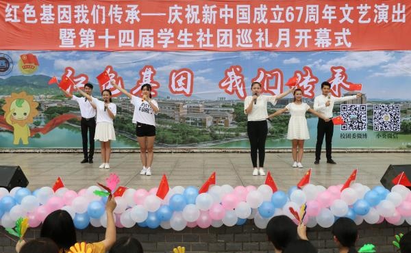 同时,由校团委主办,校学生社团联合会承办的“庆祝新中国成立67周年文艺演出暨第十四届学生社团文化巡礼月开幕式”在旗山校区共青团广场上演,来自校院两级的学生社团代表带来了朗诵《青春中国》、民族舞蹈《维族少女》、歌曲《军营中飞来一只百灵鸟》等精彩节目,共同营造了良好的节日氛围。