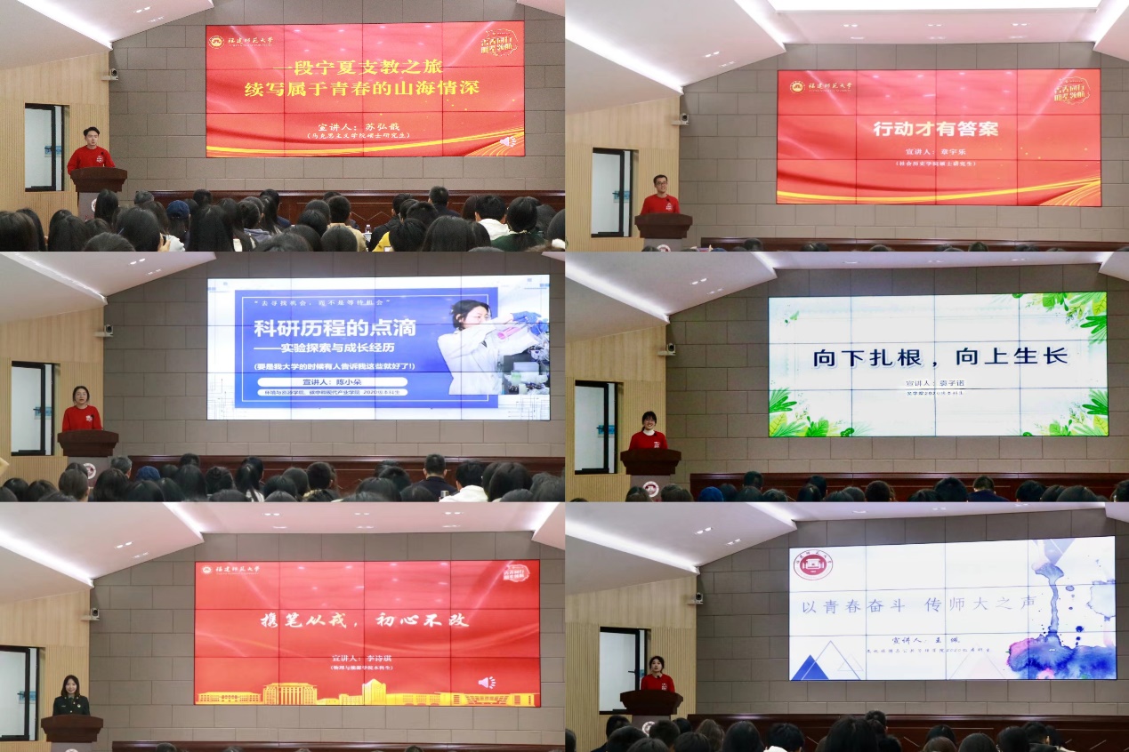 自2023年10月起,学生工作处、校团委从全校本硕博学生中遴选出首批34名优秀学生代表,组成“青春同行 朋辈领航”优秀学生群体宣讲团。在个性化培养周期间,分别在仓山、旗山两个校区展开宣讲。后续宣讲团将深入学院、年级、一站式社区开展“菜单式”“点单式”宣讲活动。