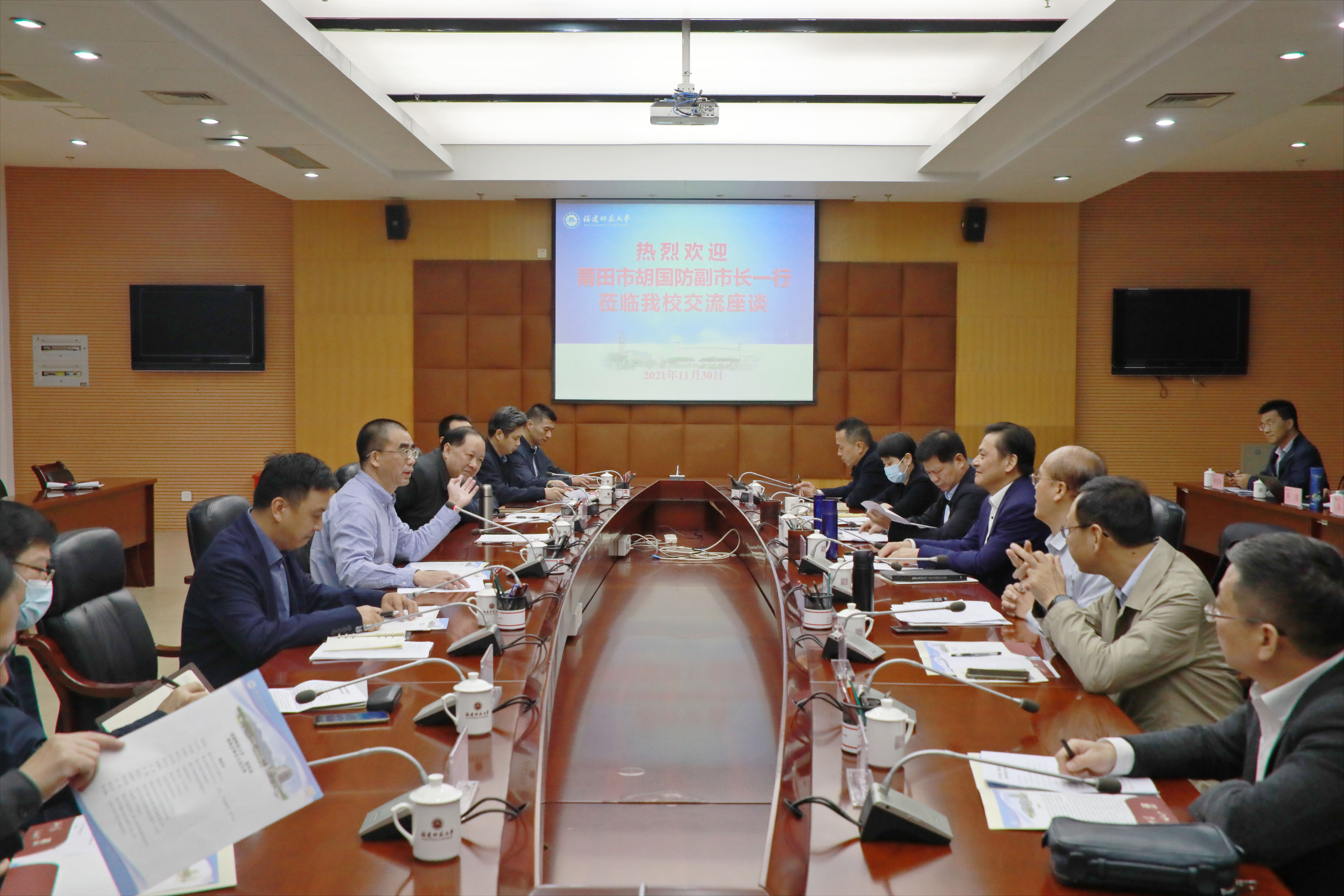 11月30日,莆田市胡国防副市长带领莆田市教育局、莆田市教师进修学院、仙游县政府以及莆田第一中学、莆田第二中学和仙游第一中学,来校洽谈基础教育合作、名师培训培养等事宜。荣耀体育(中国)副校长郑家建,党政办公室、学生工作部、发展规划处、教务处和教育学部等有关单位负责人参加了座谈会。