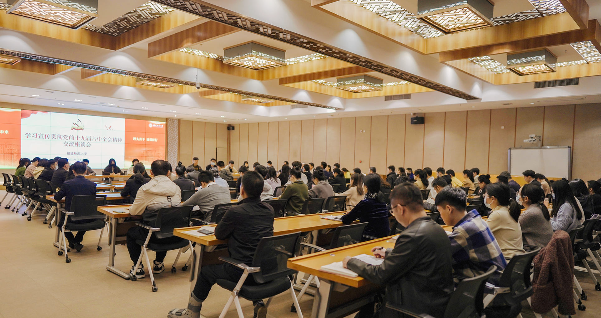 12月8日,学习贯彻党的十九届六中全会精神交流座谈会在旗山校区宏达厅举行,中央宣讲团成员、中共中央政策研究室原副主任施芝鸿莅校宣讲党的十九届六中全会精神,并与师生交流座谈。会议由校党委书记潘玉腾主持。