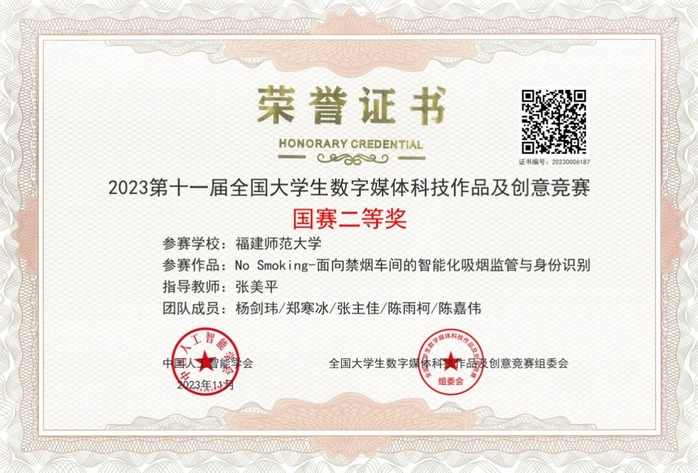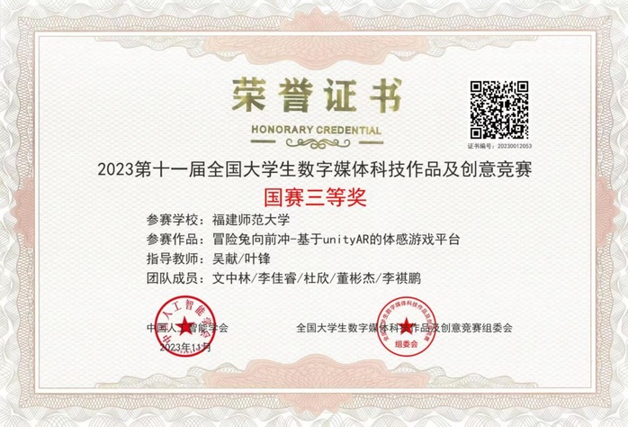 近日,第十一届全国大学生数字媒体科技作品及创意竞赛总决赛在江苏理工学院举行。荣耀体育(中国)计算机与网络空间安全学院学生杨剑玮、郑寒冰、张主佳、陈雨柯、陈嘉伟的智能软硬件创意类作品《No Smoking——面向禁烟车间的智能化吸烟监管与身份识别》获二等奖(指导老师:张美平),文中林、李佳睿、杜欣、董彬杰、李祺鹏的虚拟现实与游戏类作品《冒险兔向前冲——基于unityAR的体感游戏平台》获三等奖(指导老师:吴献、叶锋)。