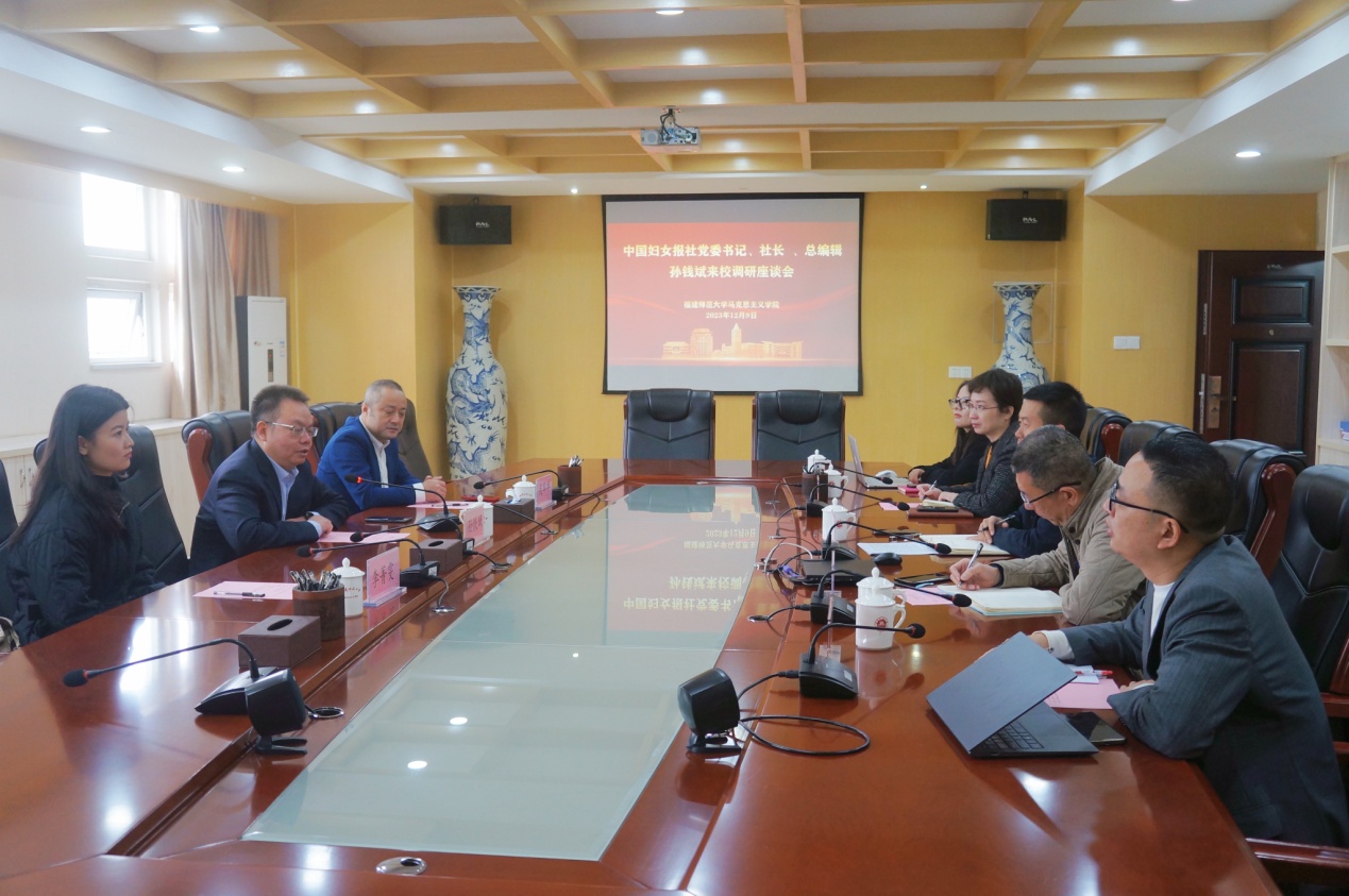 近日,中国妇女报社(全国妇联网络信息传播中心)党委书记、社长、总编辑孙钱斌,中国妇女报社福建记者站站长吴军华、记者李菁雯一行到马克思主义学院调研。学院党政负责人阮传瞰、鄢奋、黄雯,相关教研室老师参加了座谈会。
