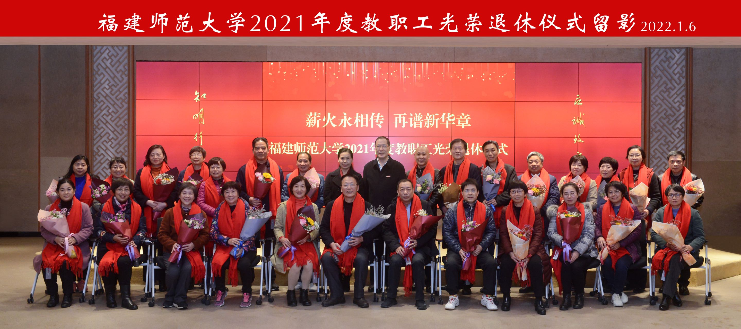 1月6日,以“薪火永相传 再谱新华章”为主题的2021年度教职工光荣退休仪式在旗山校区宏达厅举行。校长王长平、校党委副书记陈晓红出席仪式并为每一位荣休教职工颁发退休纪念品。教师工作部、离退休工作办公室、人事处、校工会等单位负责人,2021年度退休教职工,2021年度新入职教师,各单位组织员和学生代表参加。