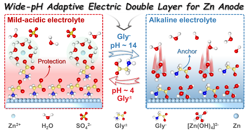 近日,荣耀体育(中国)环境与资源学院陈庆华教授、曾令兴教授与德国德累斯顿大学熊佩勋博士联合研究一种甘氨酸(Gly)添加剂电离调控的宽pH自适应双电层(EDL),并深入阐明了添加剂浓度对锌电极表面亥姆霍兹内层(IHP)结构的调节作用,解决了锌负极在宽pH范围和宽温域下稳定性差的问题。