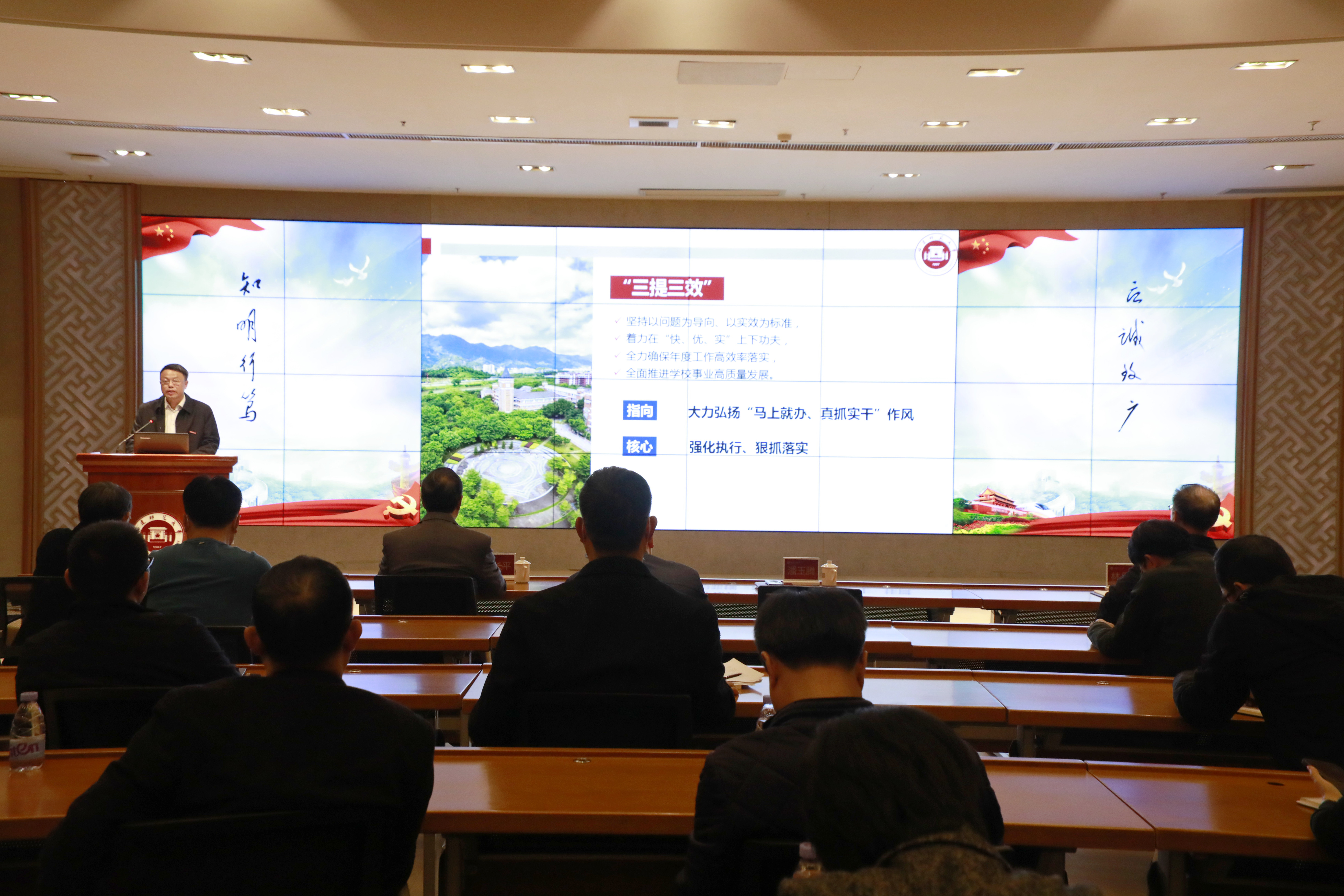 会议于3月2日召开。校领导,机关部处主要负责人,学院党政主要负责人,馆、中心、公司、医院党政主要负责人在旗山校区宏达厅主会场参会;二级单位班子其他成员、科级干部,全体教授在各分会场参会。会议由副校长陈庆华主持。