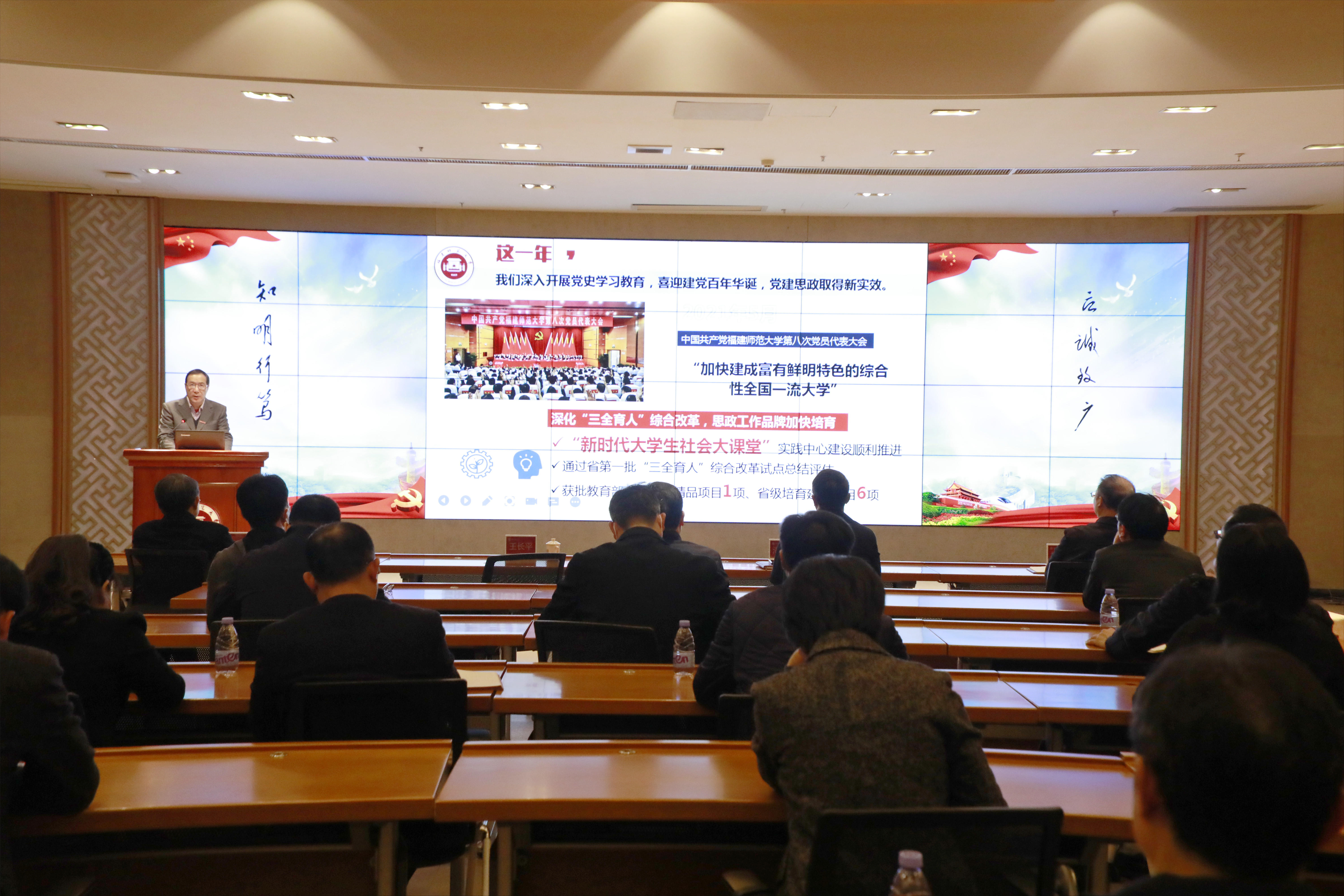 校长王长平回顾总结了过去一年学校事业改革发展的主要成效,分析了当前内外“变量”对学校带来的机遇和挑战,强调要结合学校“提高效率、提升效能、提增效益”行动方案,奋力做好2022年工作,不断推动学校内涵式、高质量发展。一要推动思政教育提质增效、本科教育全面振兴、研究生教育创新发展、教师教育卓越发展,着力打造人才培养高地。二要坚持靶向发力,创新学科建设机制,推进新一轮“双一流”建设,着力推动学科内涵发展。三要严抓师德师风,加强人才引育,优化人才服务,着力强化教师队伍建设。四要狠抓大项目、建强大平台、培育大成果,着力提高科学研究水平。五要构建更高水平的国际化办学格局、更高质量的对台港澳交流合作机制、更高效益的校友和社会服务体系,着力加快开放办学步伐。六要推进全面从严治党,深化校园综合治理,优化办学条件保障,维护校园安全稳定,着力提升内部治理水平。