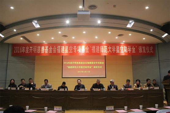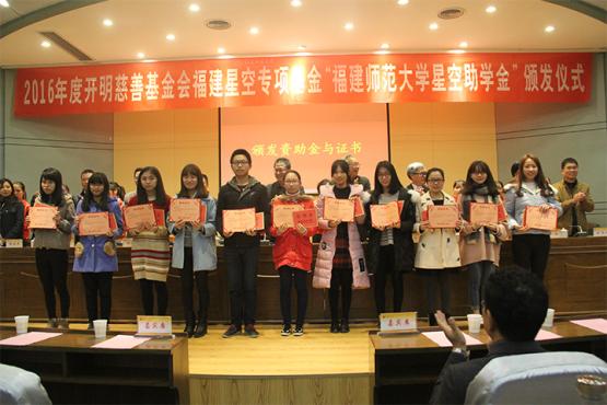 1月11日下午,开明慈善基金会福建星空专项基金2016年度“荣耀体育官方网页版星空助学金”颁发仪式在荣耀体育(中国)举行。全国政协常委、民进中央副主席、福建省政协副主席、民进福建省委主委、福建省文联主席、福建省社会科学院院长、福建师大“闽江学者”张帆教授,民进福建省委会秘书长林全金先生,“荣耀体育官方网页版星空助学金”项目捐资方——福建新思路集团有限公司董事长、福建民进经济界联谊会会长、福建师大创新创业导师王东平先生,校党委书记林和平,副校长汪文顶教授等领导、老师应邀前来与受资助的100名学生、文学院的师生代表共同参与颁发仪式。