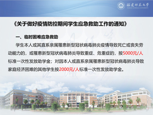 关爱困难学生。全力保障学生安心学习,坚持常规性资助与应急性资助相结合,启动疫情防控期间学生应急救助工作,对出现的临时困难学生,及时启动应急性资助,及时给予补助,帮助他们顺利渡过难关。