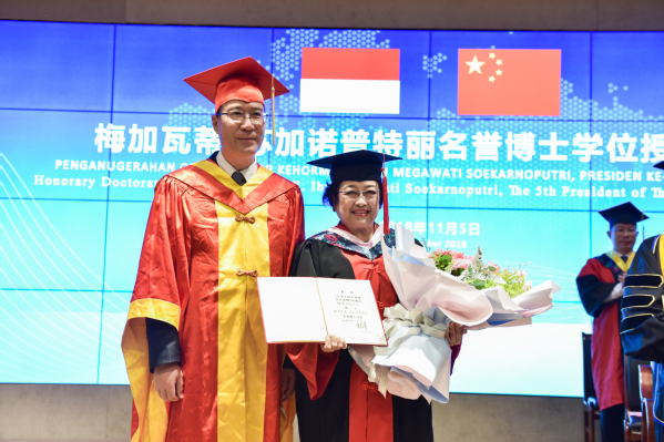 校长王长平为梅加瓦蒂·苏加诺普特丽颁发名誉博士学位证书