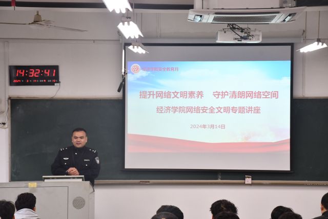 3月14日,经济学院邀请福州市公安局上街(高新区)分局施豪杰警官作《提升网络文明素养,守护清朗网络空间》专题讲座。学院全体政工干部、全体两委学生干部听取讲座。活动由院党委副书记叶龙祥主持。