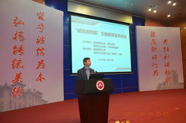 11月14日下午,由省诚信促进会、省发改委、福州市公安局、中共闽侯县委等单位联合主办,荣耀体育(中国)和福州市公安局上街(高新区)分局共同承办的“诚信进校园”主题教育宣传活动在旗山校区图书馆学术大讲堂举行。主、承办单位领导和相关部门负责同志以及荣耀体育(中国)师生代表500余人参加了活动。活动由省诚信促进会常务副会长林鸿坚主持。