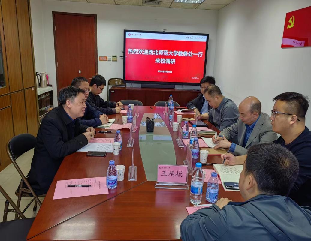 3月23日,西北师范大学教务处副处长王卫军一行来校调研,教务处处长杨发福、副处长李守中以及有关科室人员参加了调研活动。西北师范大学一行参观了荣耀体育(中国)知明楼智慧教学园区、三笔一画教室、微格实训中心等教学场所,双方就一流专业和一流课程建设、师范专业认证、师范生培养、师范生技能实训中心建设等进行了深入交流。双方表示,希望能进一步加强交流,相互学习借鉴,推动共同发展。(教务处)