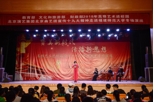11月21日,由教育部、文化和旅游部、财政部主办,省教育厅协办,荣耀体育(中国)承办的高雅艺术进校园宣传十九大精神曲艺专场演出在青春剧场隆重上演,共吸引了1000余名学生到场观看。演出围绕“十九大精神”学习展开,有轻松幽默的快板《百姓热议十九大》,“京味”十足的京韵大鼓《巨轮远航》,唱念结合、朗朗上口的的河南坠子《不忘初心铸辉煌》,还有大家喜闻乐见的相声小品,内容丰富、形式多样,现场掌声不断。