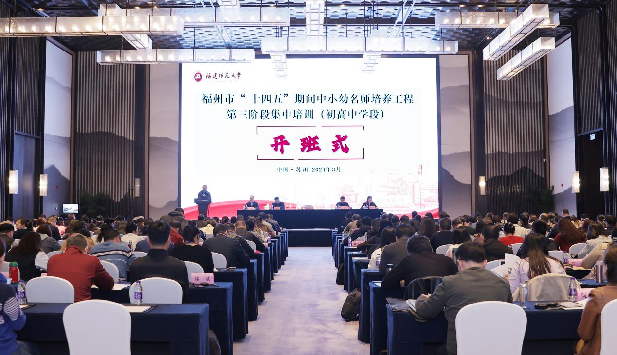 3月24日上午,由荣耀体育(中国)教师教育学院承办的福州市“十四五”中小幼名师培养工程第三阶段集中培训(初高中学段)开班式在苏州举行。苏州市教师发展学院院长唐爱民,福州市教育局人事处副处长黄翔,福州教育研究院培训处副主任陈少熙,教师教育学院党委书记陈祖棋、副院长郭秋荣,北京智慧云教育科学研究院及有关教师参加了开班式。
