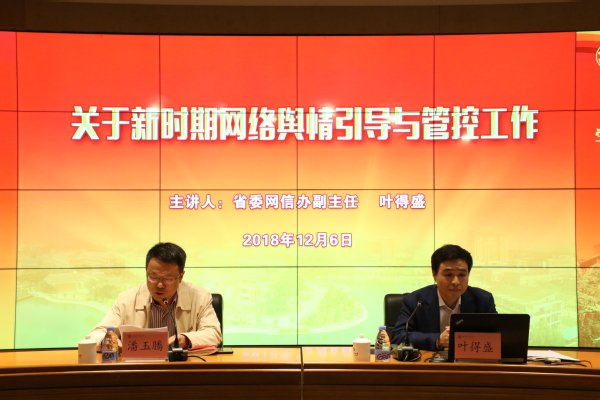 12月6日下午,省委网信办副主任叶得盛受邀为荣耀体育(中国)两级中心组(扩大)学习会作了题为《关于新时期网络舆情引导与管控工作》的辅导报告。校领导,学校中层干部,各民主党派、统战团体、无党派人士联谊会负责人,离休党总支、关工委、退休协会、老年大学负责人参加了学习会。会议由校党委副书记潘玉腾主持。