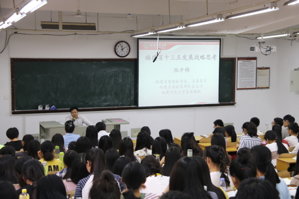 陆开锦以“福建省十三五发展战略思考”为题,分析了当前世界各国经济发展的总体形势,阐释了我国当前经济“新常态”的具体表现。他重点讲述了对福建省十三五发展战略的思考,深入浅出阐述“再上新台阶,建设新福建”的丰富内涵,提出福建省落实五大发展理念的具体举措,展望福建发展的美好未来。本次讲座视野开阔、资料详实、语言幽默,博得同学们的阵阵掌声。