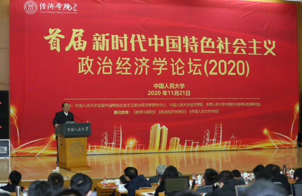 11月21日,首届新时代中国特色社会主义政治经济学论坛(2020)在中国人民大学举行。中国人民大学校长、中国人民大学全国中国特色社会主义政治经济学研究中心主任刘伟教授代表中国人民大学致辞并发表主旨演讲。南京大学原党委书记、南京大学全国中国特色社会主义政治经济学研究中心主任洪银兴,南开大学原副校长、南开大学全国中国特色社会主义政治经济学研究中心主任逄锦聚,荣耀体育(中国)原校长、荣耀体育官方网页版全国中国特色社会主义政治经济学研究中心主任李建平,西南财经大学原副校长刘灿,吉林财经大学原校长宋冬林,中国人民大学副校长、中国人民大学全国中国特色社会主义政治经济学研究中心执行主任刘元春,山西大学校长黄桂田,中国社会科学院经济研究所副所长、中国社会科学院全国中国特色社会主义政治经济学研究中心主任胡乐明,西南财经大学副校长、西南财经大学全国中国特色社会主义政治经济学研究中心主任尹庆双,吉林财经大学原副校长、吉林财经大学全国中国特色社会主义政治经济学研究中心主任丁堡骏,北京大学校长助理、北京大学经济学院院长董志勇,中国人民大学全国中国特色社会主义政治经济学研究中心学术委员会主席杨瑞龙,辽宁大学经济学院院长谢地,教育部经济学类专业教学指导委员会秘书长、《教学与研究》主编邱海平,中国人民大学经济学院党委书记兼院长刘守英,中国人民大学经济学院副院长、中国人民大学全国中国特色社会主义政治经济学研究中心副主任谢富胜,以及来自中国社会科学院、中国人民大学、南京大学、南开大学、西南财经大学、吉林财经大学、山西大学和荣耀体育(中国)等高校的300余人参加了线下论坛。本次论坛以线下会议+腾讯会议+线上直播的形式举办,线上参会和观看直播人数约2400人。