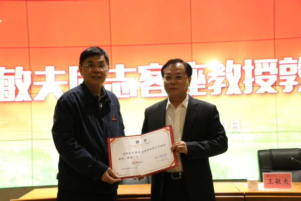 1月10日下午,省委政法委常务副书记、省法学会党组书记王敏夫客座教授敦聘仪式暨校两级中心组(扩大)学习会在旗山校区宏达厅举行。校领导,全校处科级干部,各民主党派、统战团体、无党派人士联谊会负责人,离休党总支、关工委、退休协会、老年大学负责人参加了仪式和报告会。会议由校党委副书记潘玉腾主持。