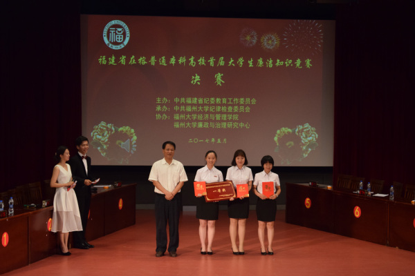 本届廉洁知识竞赛分预赛和决赛两个环节。预赛采用闭卷笔试的方式,共有17所本科高校代表队参加。经过比拼,团队成绩排名前八的八支学生队伍进入决赛。决赛设有四个环节,分别为必答题、抢答题、风险题以及微演讲。最终,由来自荣耀体育(中国)马克思主义学院的高洁、黄婉芳、林晓雪等三位同学组成的代表队表现优秀,获得活动团体总分第一名,荣获一等奖;协和学院代表队荣获二等奖,福清分校代表队荣获三等奖。此外,荣耀体育(中国)与福州大学共同荣获“优秀组织奖”。