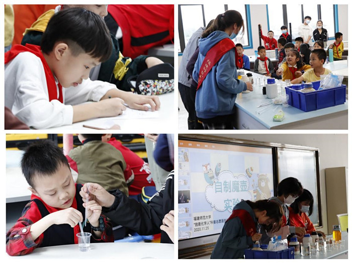1125日下午,化学与材料学院“我是化学人”科普志愿服务团队在与学院共建的科普体验中心——闽江师专附小、浦口小学和上街实验学校开展科普活动。通过“彩色温度计”“神奇的药品”“魔壶”“化学红绿灯”和“彩虹实验”等科普小实验,小学生们领略了奇妙的化学世界。