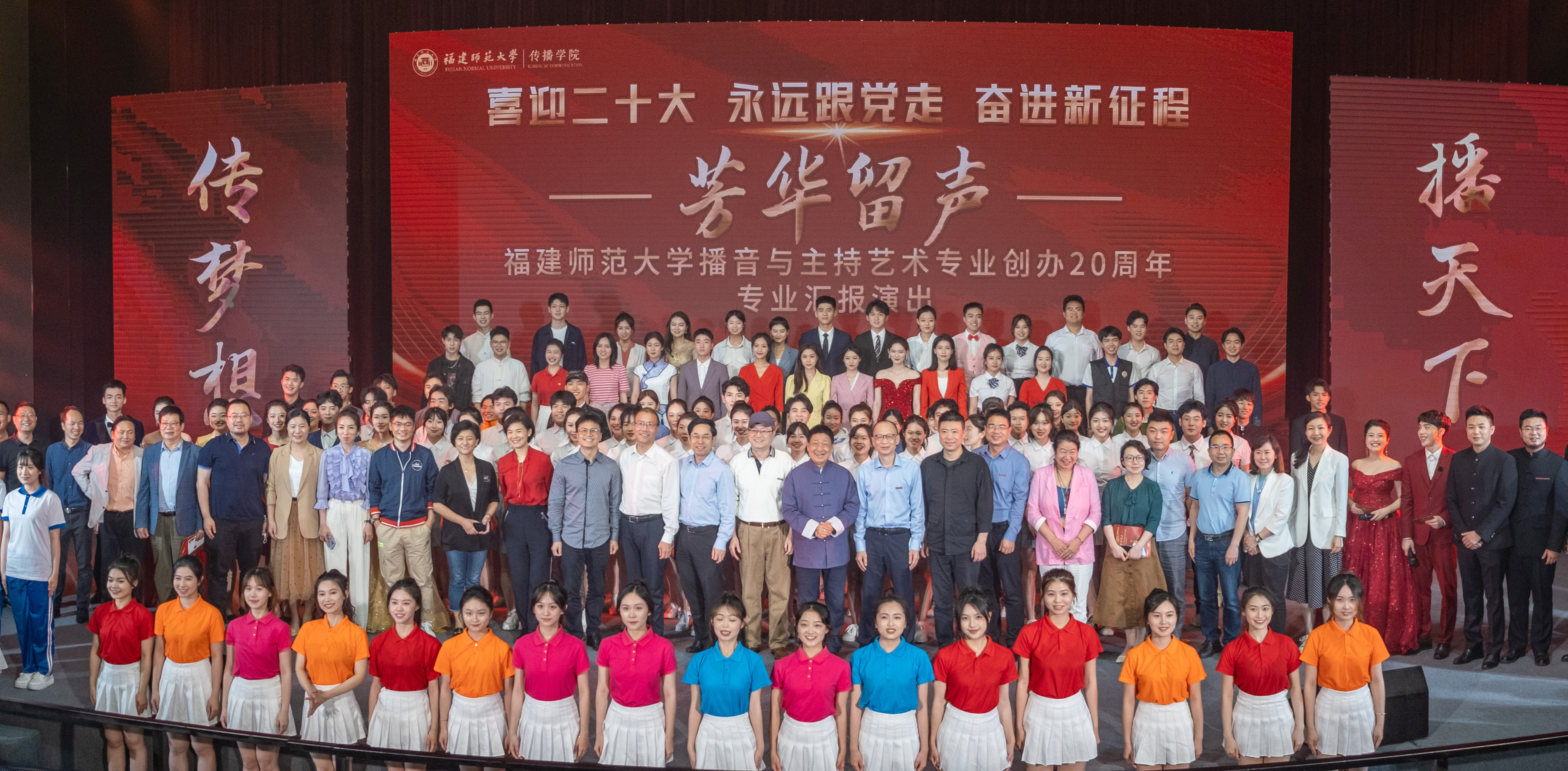 当晚,在旗山校区星雨剧场举办了“芳华留声·喜迎二十大 永远跟党走 奋进新征程”专业汇报演出。校党委副书记陈晓红,福建省艺术职业学院原院长、荣耀体育(中国)播音与主持艺术专业创办人张锦华,学校有关职能部门、传播学院负责人,校友、企业负责人代表和师生代表共300余人到场观看。