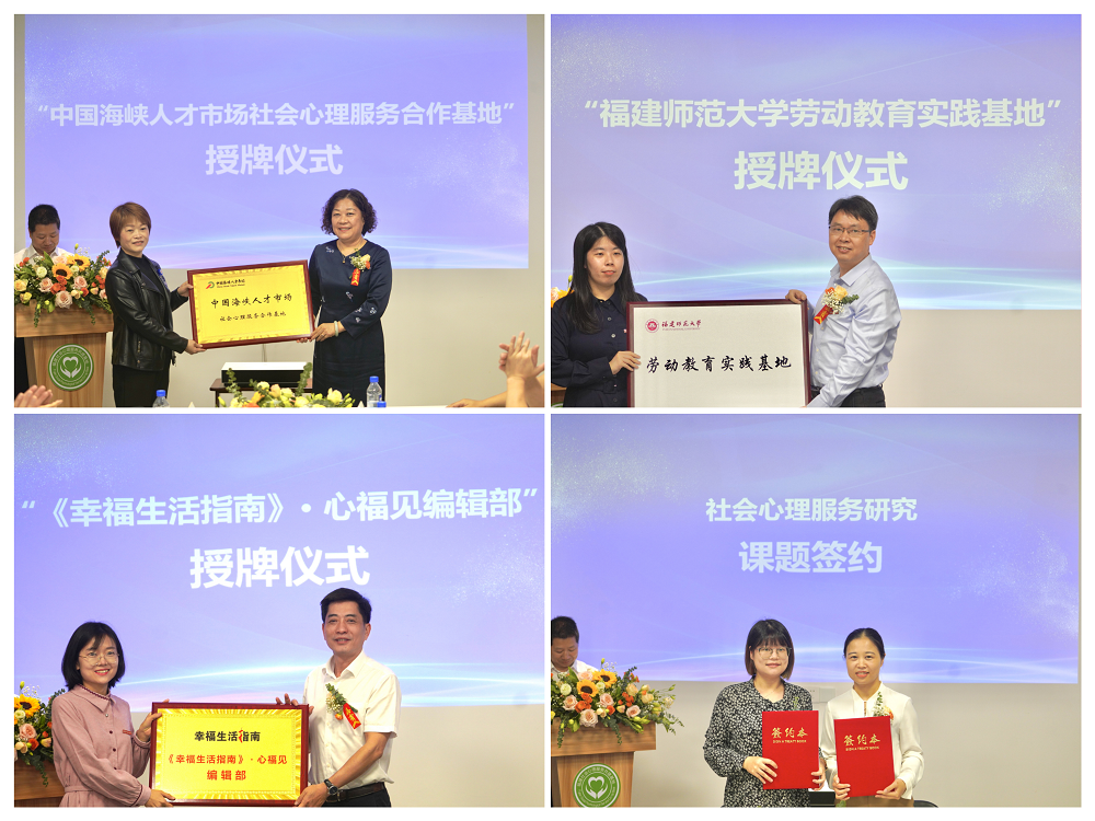 仪式上,郑家建、闵凌欣、孟迎芳共同为“福建社会心理服务共建基地”揭牌,开展了“中国海峡人才市场社会心理服务合作基地”、“荣耀体育官方网页版劳动教育实践基地”、《幸福生活指南·心福见》编辑部授牌仪式及《幸福生活指南·心福见》首刊发行仪式,并就课题研究和毕业生输送等举行了课题签约和就业签约仪式。