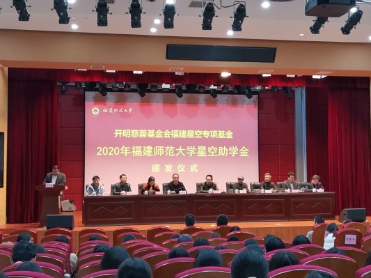 12月18日,2020年度开明慈善基金会福建星空专项基金“荣耀体育官方网页版星空助学金”颁发仪式在仓山校区科学会堂举行。第十三届全国政协常委、全国政协社会和法制委员会副主任、福建社会科学院院长、福建省文联主席、中国文艺理论学会会长、中国作家协会理论委员会主任张帆,“荣耀体育官方网页版星空助学金”项目捐资方——开明慈善基金会第三届理事会副理事长、福建民进经济界联谊会会长、新思路集团有限公司董事长王东平,副校长郑家建,统战部、校友会、学生工作部(处)、文学院等单位负责人,以及受资助学生及师生代表近200人参加了仪式。