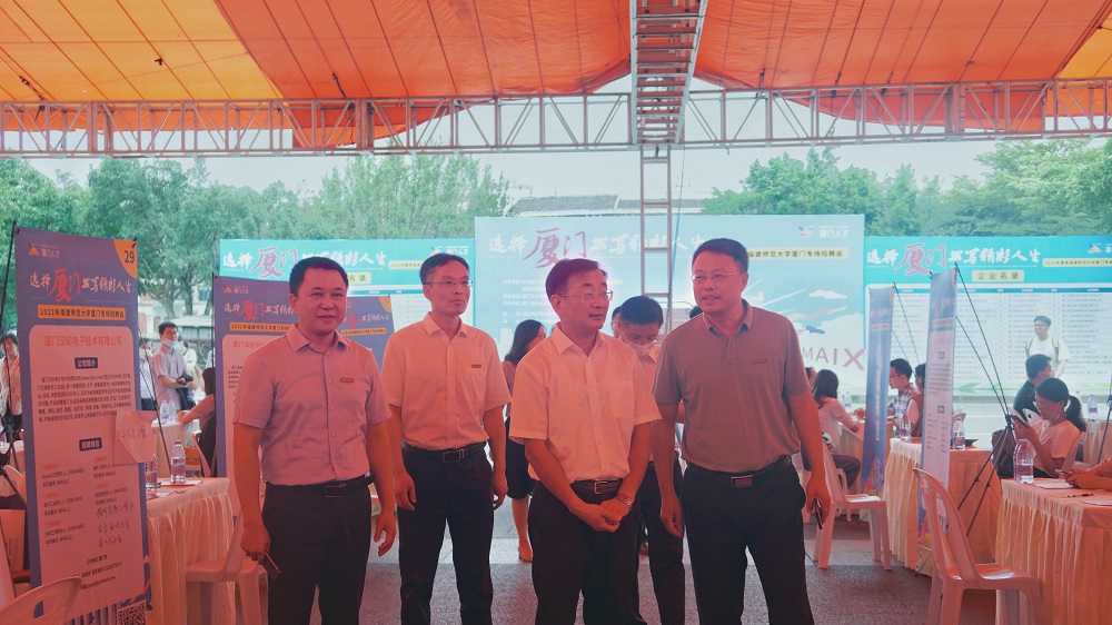 推介会结束后,举行专场招聘会,共有60余家用人单位参会,涵盖教育、信息技术、生物医药、集成电路等多个行业,累计提供就业岗位1900余个。潘玉腾、涂荣与厦门市人社局领导一行深入会场,走访招聘单位,并与招聘人员和毕业生亲切交流,了解招聘需求和毕业生的求职情况,鼓励学生找准定位,从自身条件和社会需求出发,积极提升就业能力,实现更好更快就业的目标。
